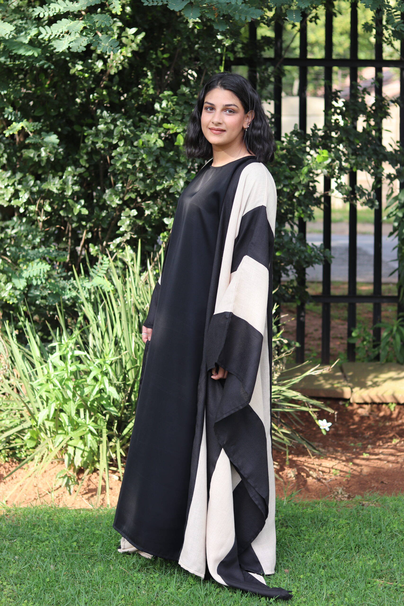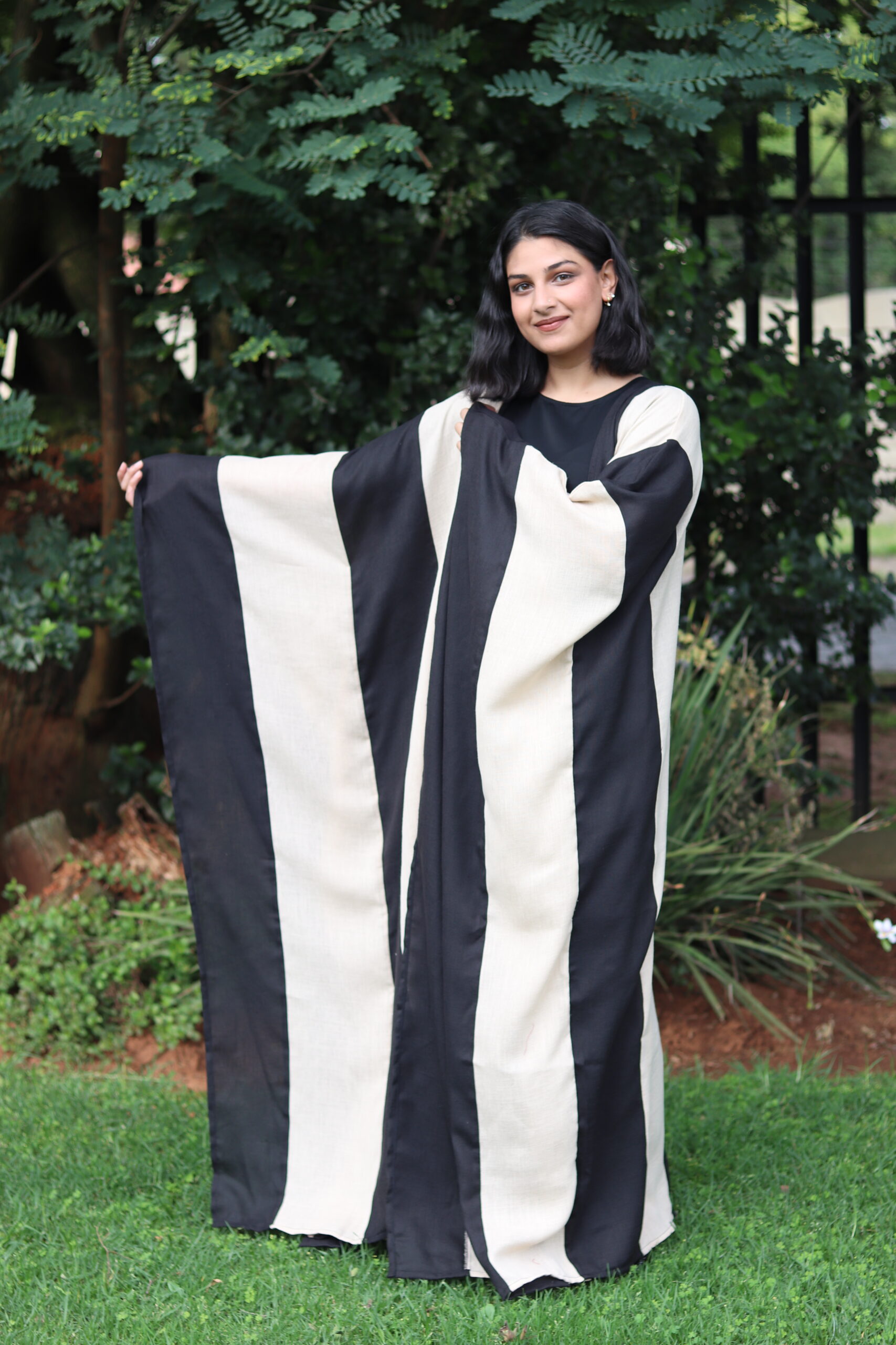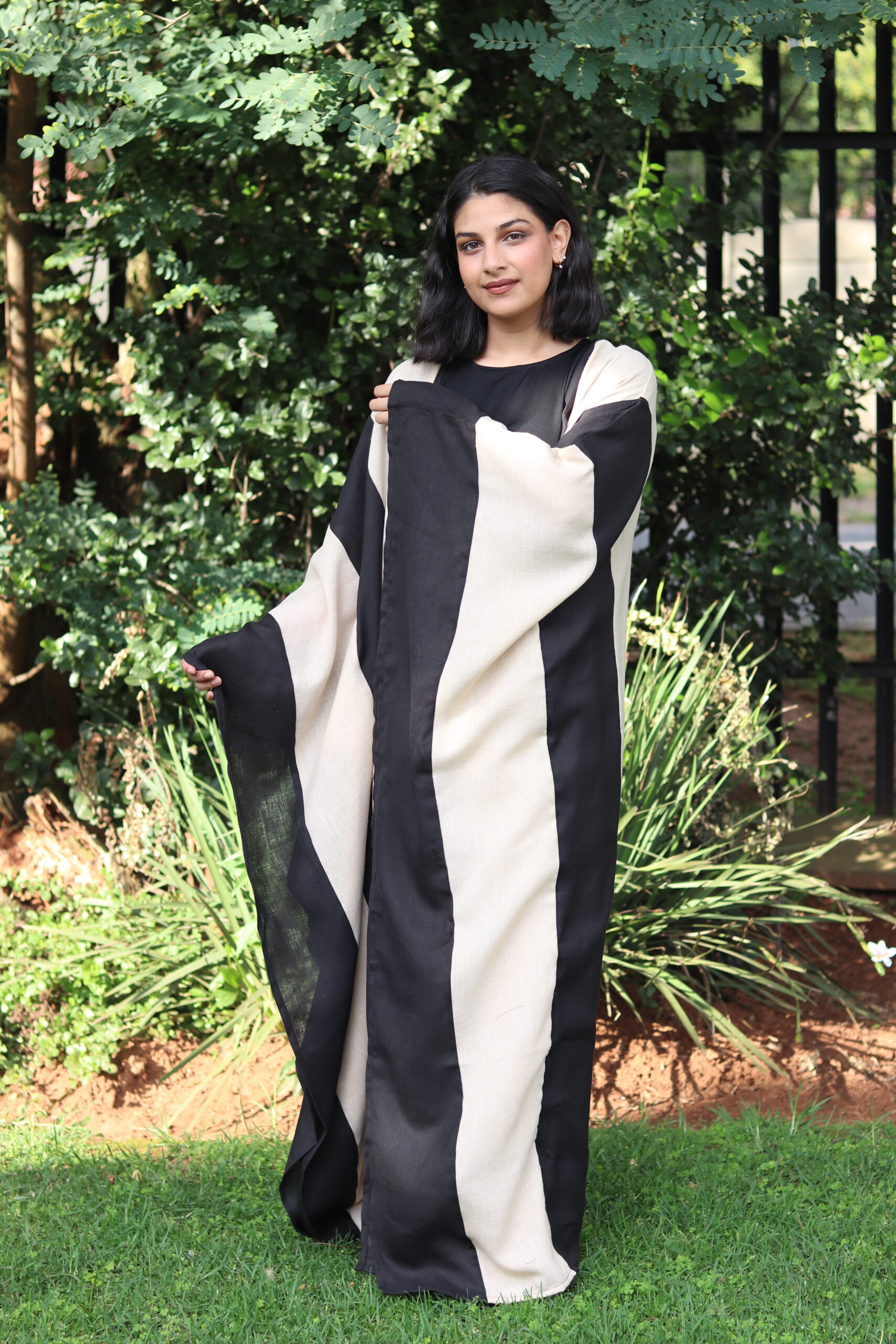 Elevate your style with the Black & Beige Linen Inner Dress, Throw & Scarf Set from Allure Adornments. This coordinated set features a flowing inner dress, a matching throw, and a stylish scarf, all crafted in breathable linen with a chic black and beige design for a modern, sophisticated look.