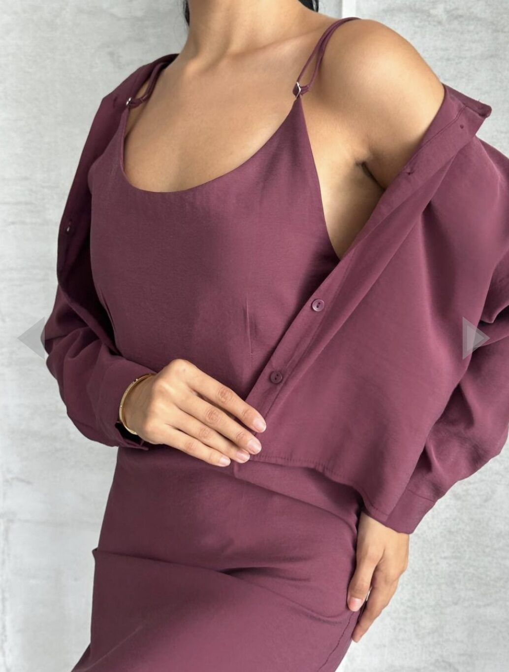 Chic and versatile, the Burgundy-Purple Dress & Button-Down Shirt Set from Allure Adornments adds a touch of elegance to any occasion. Featuring a flowing dress paired with a matching button-down shirt, this set combines comfort with sophisticated style — perfect for both day and evening wear.